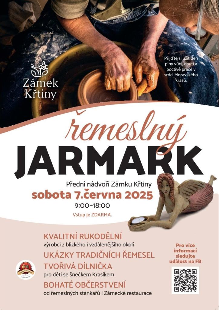 Na řemeslném jarmarku ve Křtinách se můžete těšit na pestrou nabídku tradičních výrobků. Dokonce uvidíte při práci přadlenu, kováře nebo se budete moct podívat na ukázku sochání z hlíny. K tomu všemu si budete moct poslechnout hru na harfu.